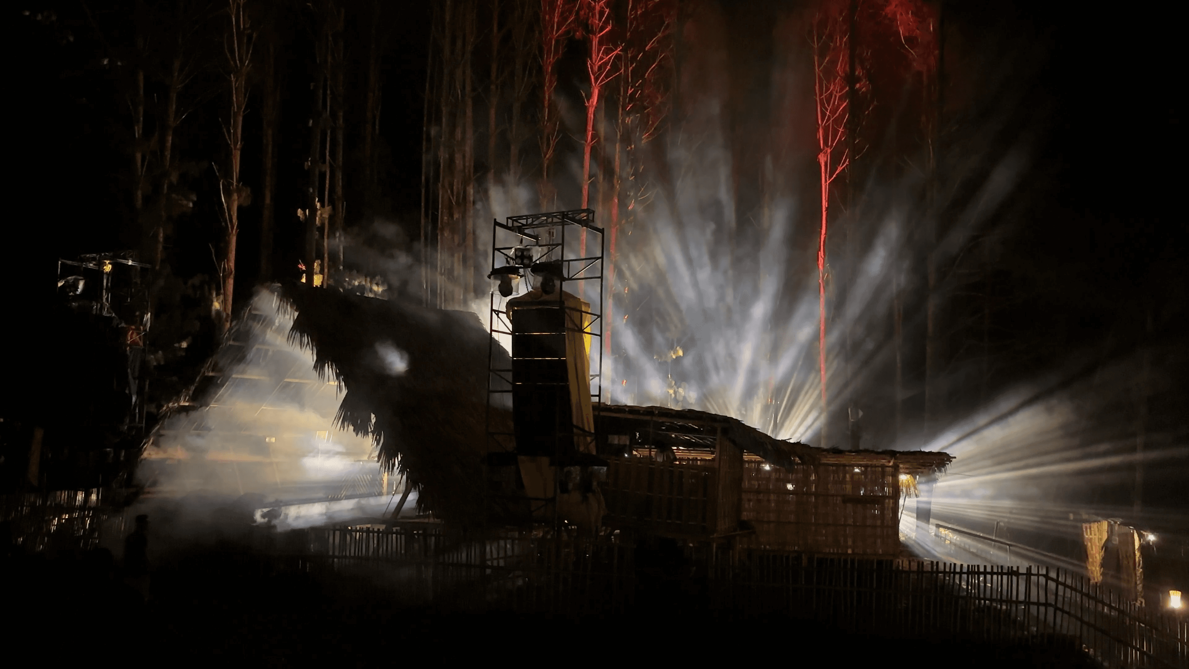 A bamboo stage amidst the hilly woods with lights and projection bringing the trees to life