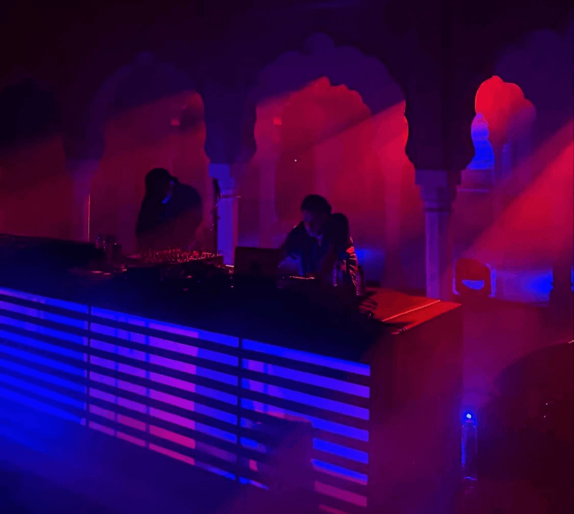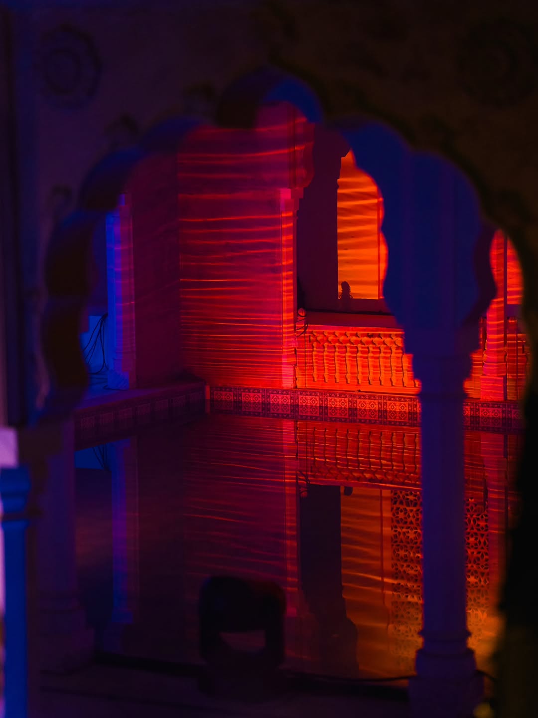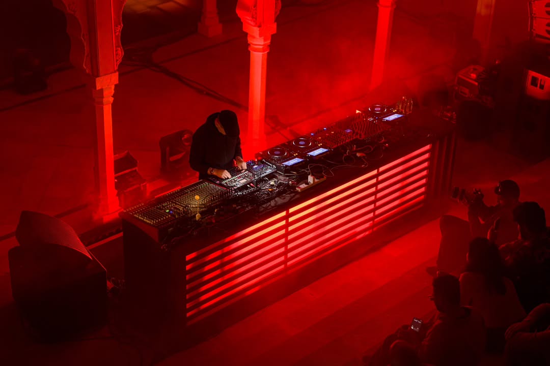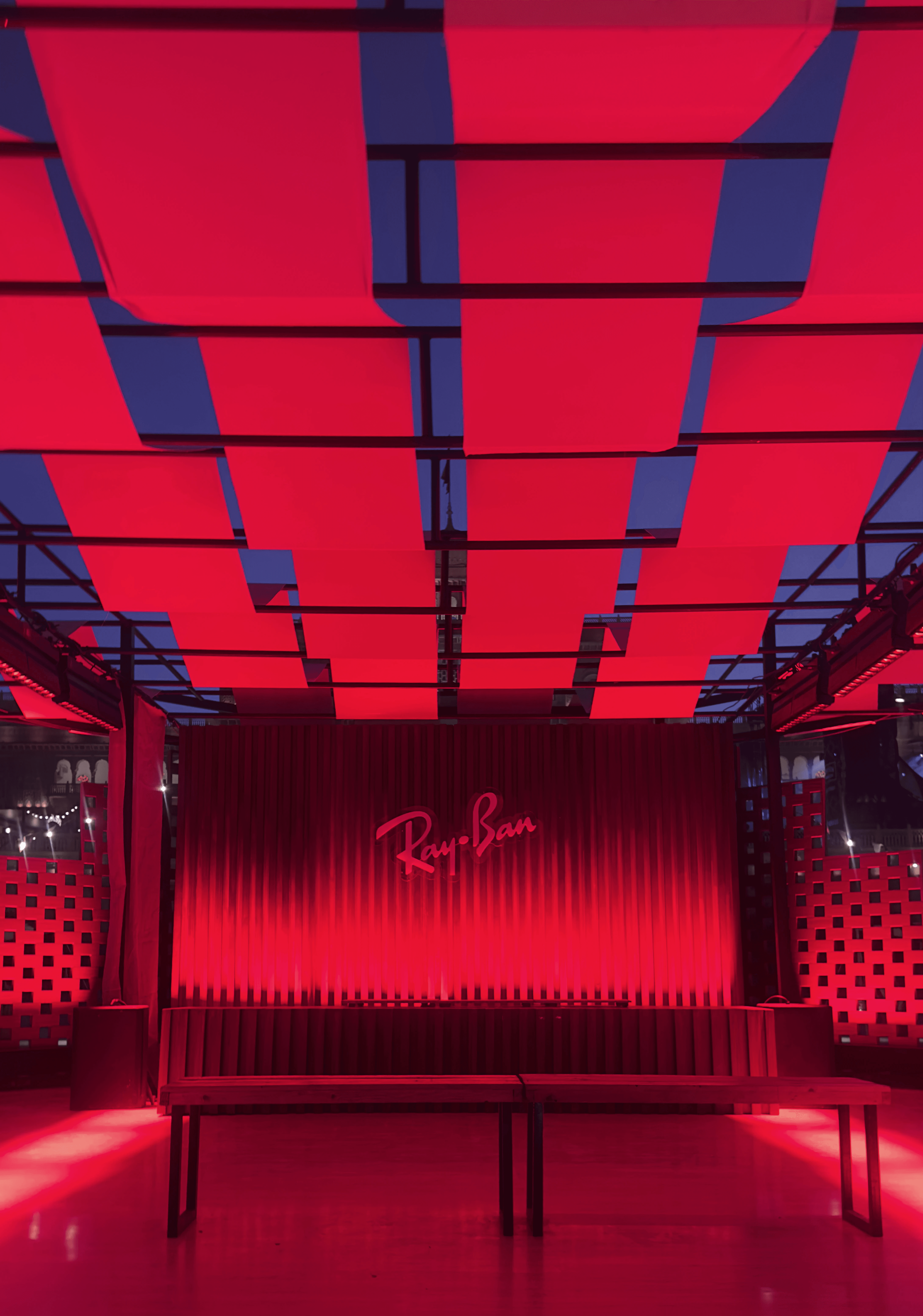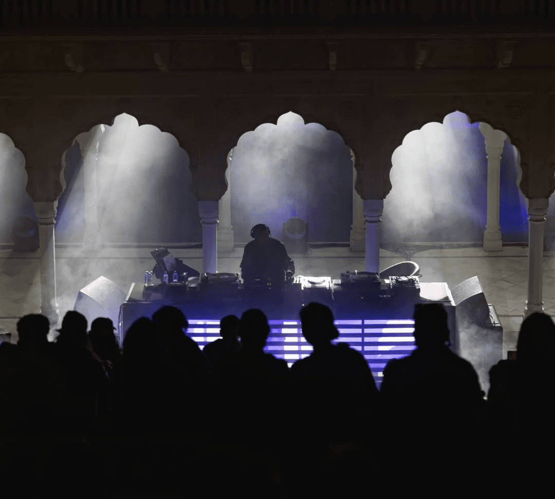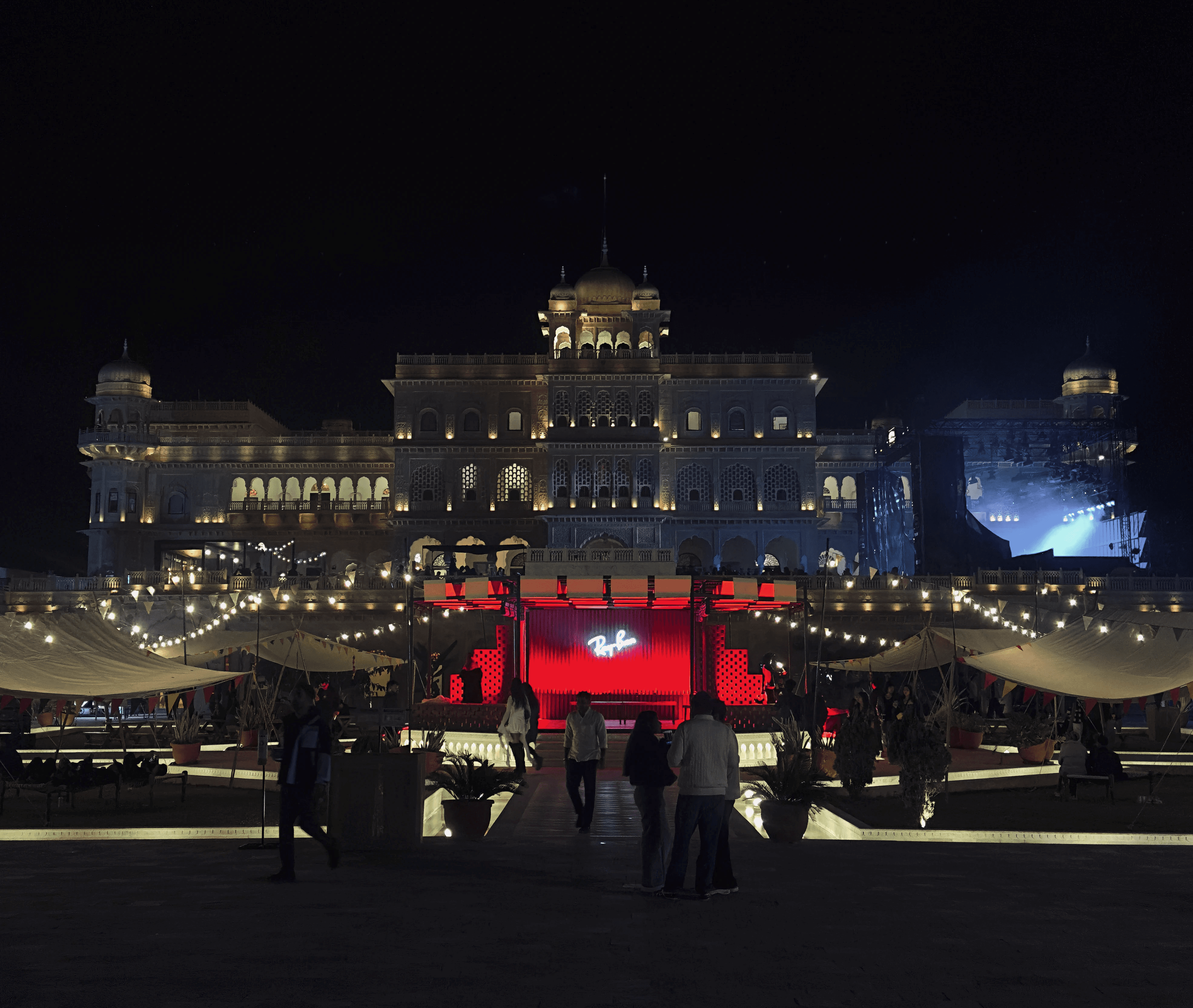 The Stepwell stage used subtle moving reflections from the surrounding water, creating soft, shifting light textures that complemented the ambient music showcase. The East stage played with shadow and form - light passing through cut-out motifs of the festival logo filled the haze, illuminating the raw scaffolding structure and creating layered silhouettes across the space. The Yurt glowed with warm pastel tones filtering through wooden cut-outs, transforming the circular arena into an intimate space bathed in soft, radiant light. The Club featured a retro LED installation with horizontal cuts, creating bold visual rhythms and sharp contrasts against the darkness. The Rayban stage, Positioned at the centre of the festival grounds out with a warm red glow amidst a wide green courtyard. Since this is the first look, on entering the palace the aim was to make it warm and inviting.
