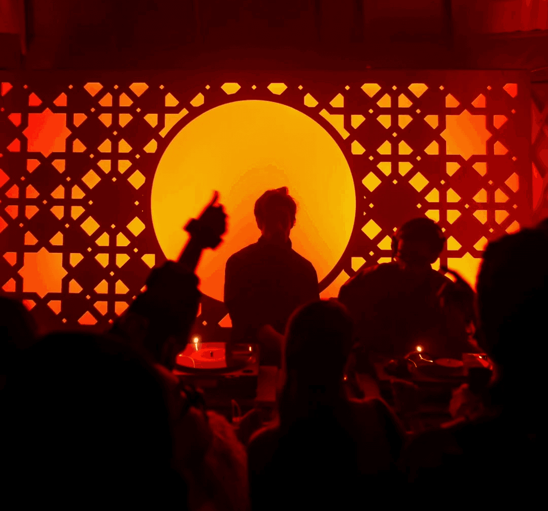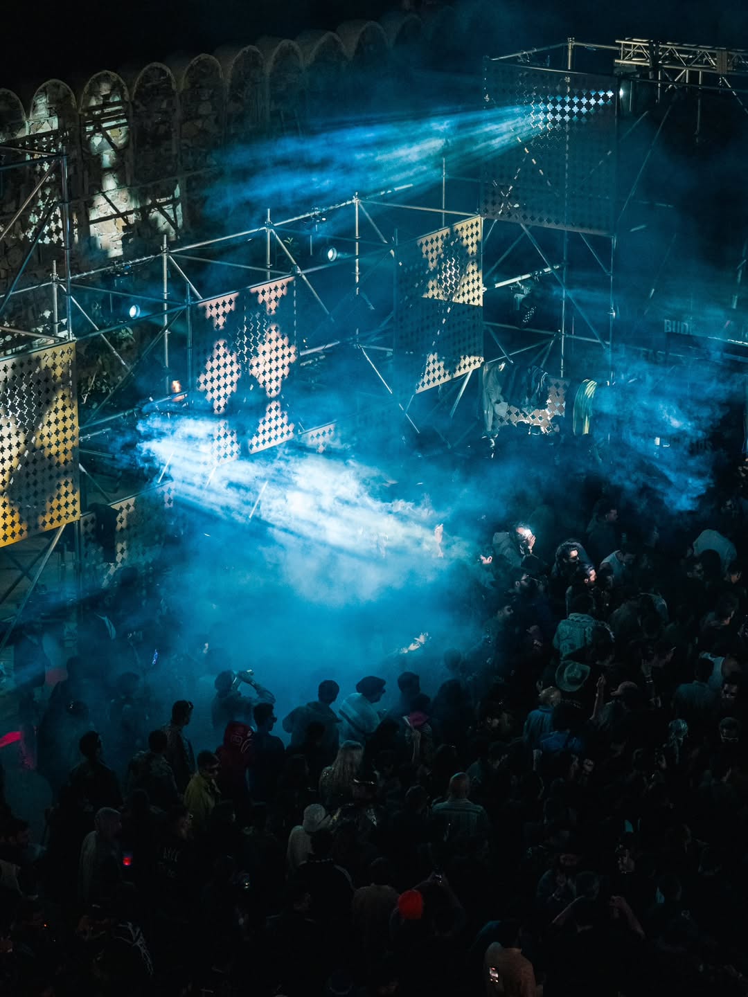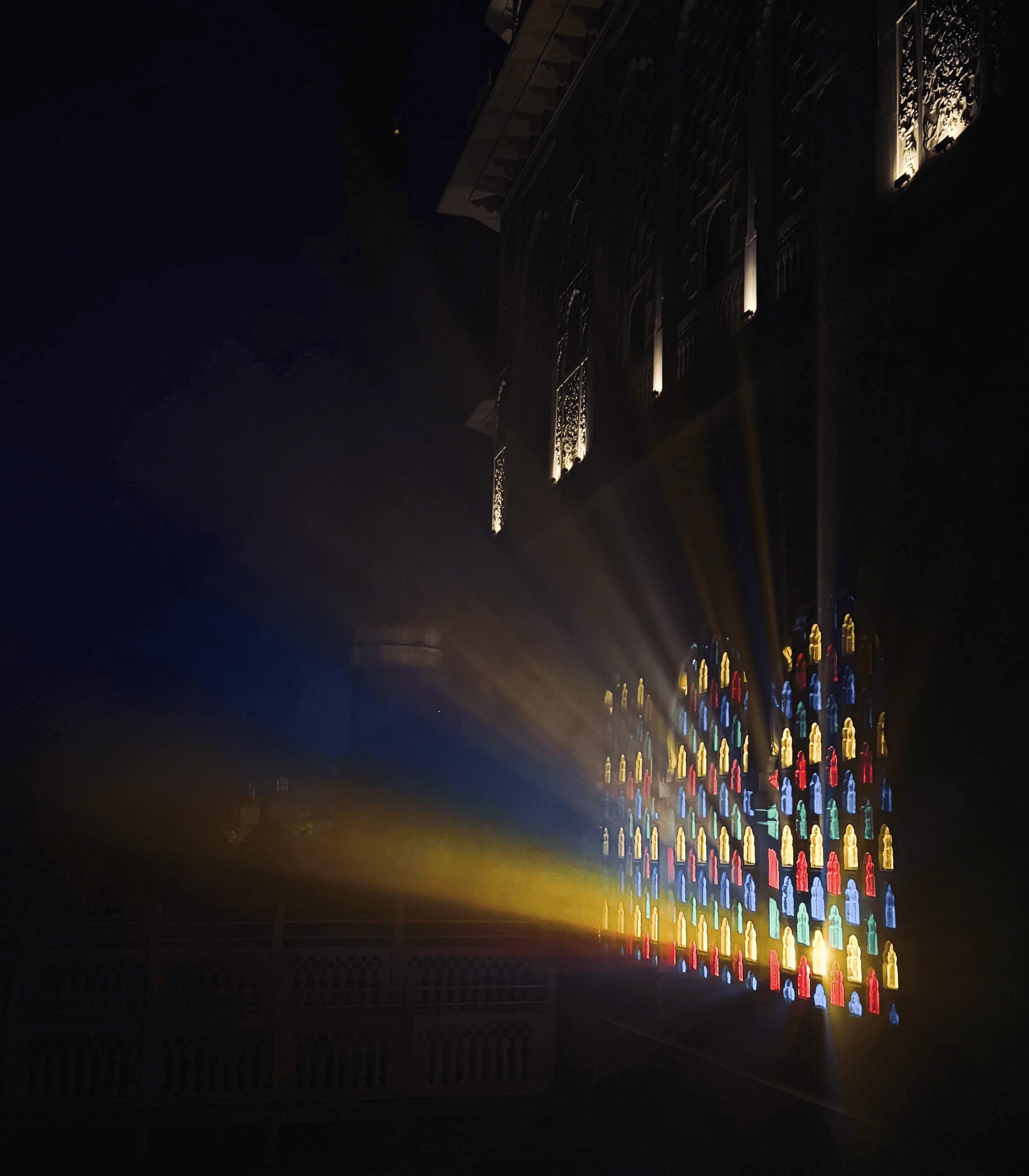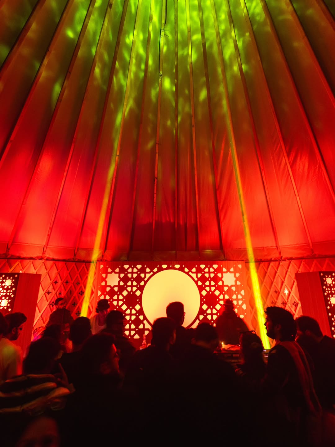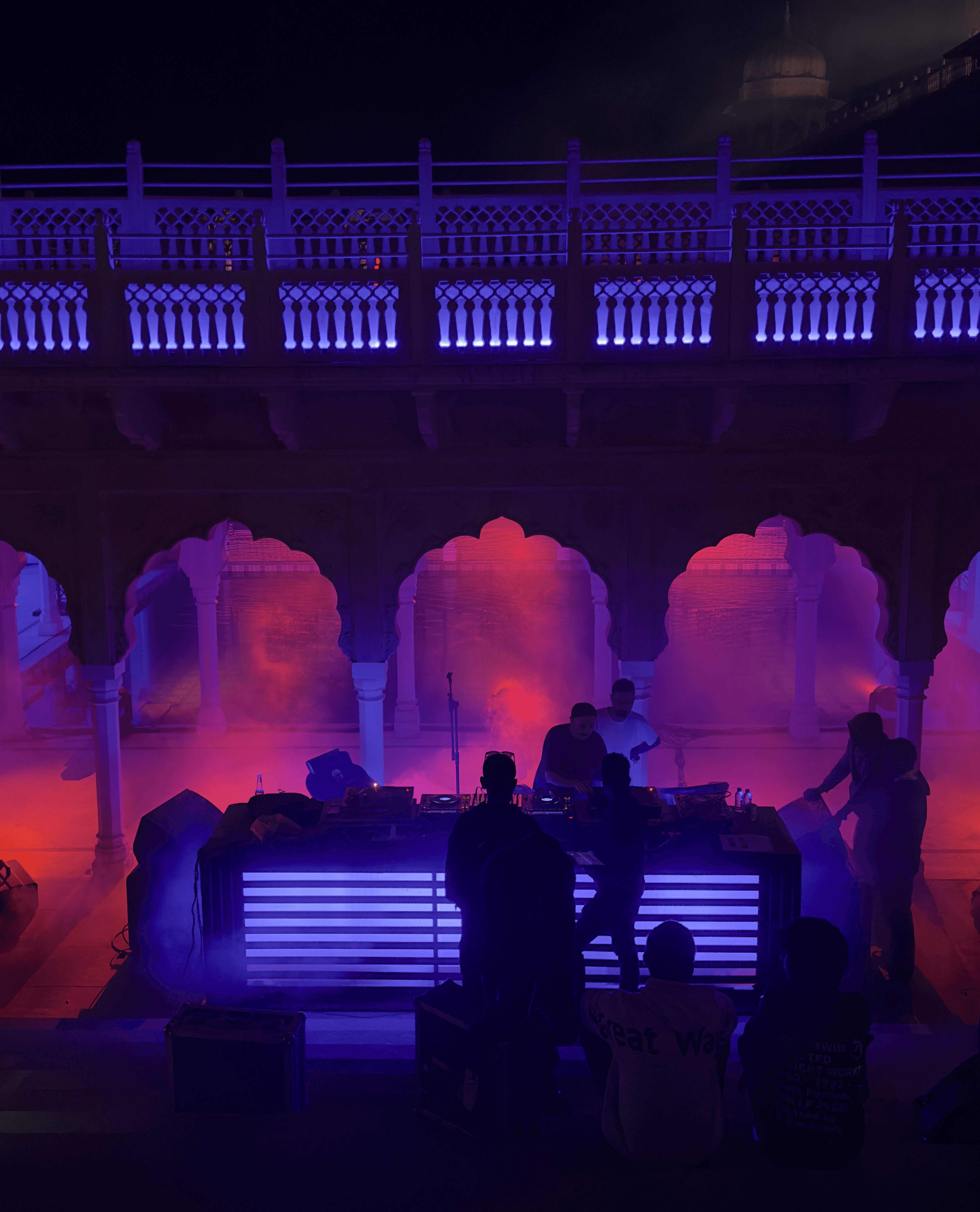 The Stepwell stage used subtle moving reflections from the surrounding water, creating soft, shifting light textures that complemented the ambient music showcase. The East stage played with shadow and form - light passing through cut-out motifs of the festival logo filled the haze, illuminating the raw scaffolding structure and creating layered silhouettes across the space. The Yurt glowed with warm pastel tones filtering through wooden cut-outs, transforming the circular arena into an intimate space bathed in soft, radiant light. The Club featured a retro LED installation with horizontal cuts, creating bold visual rhythms and sharp contrasts against the darkness. The Rayban stage, Positioned at the centre of the festival grounds out with a warm red glow amidst a wide green courtyard. Since this is the first look, on entering the palace the aim was to make it warm and inviting.