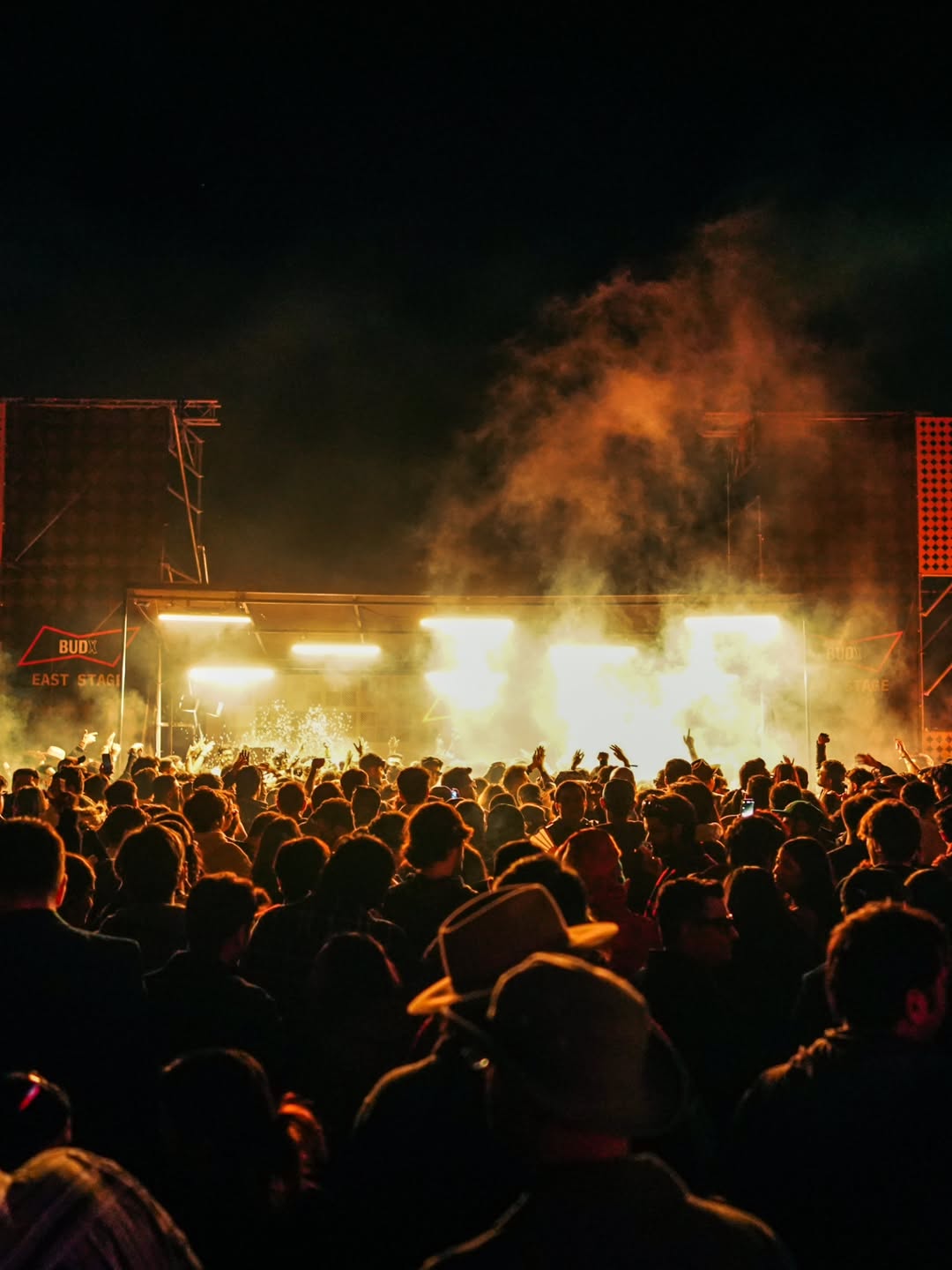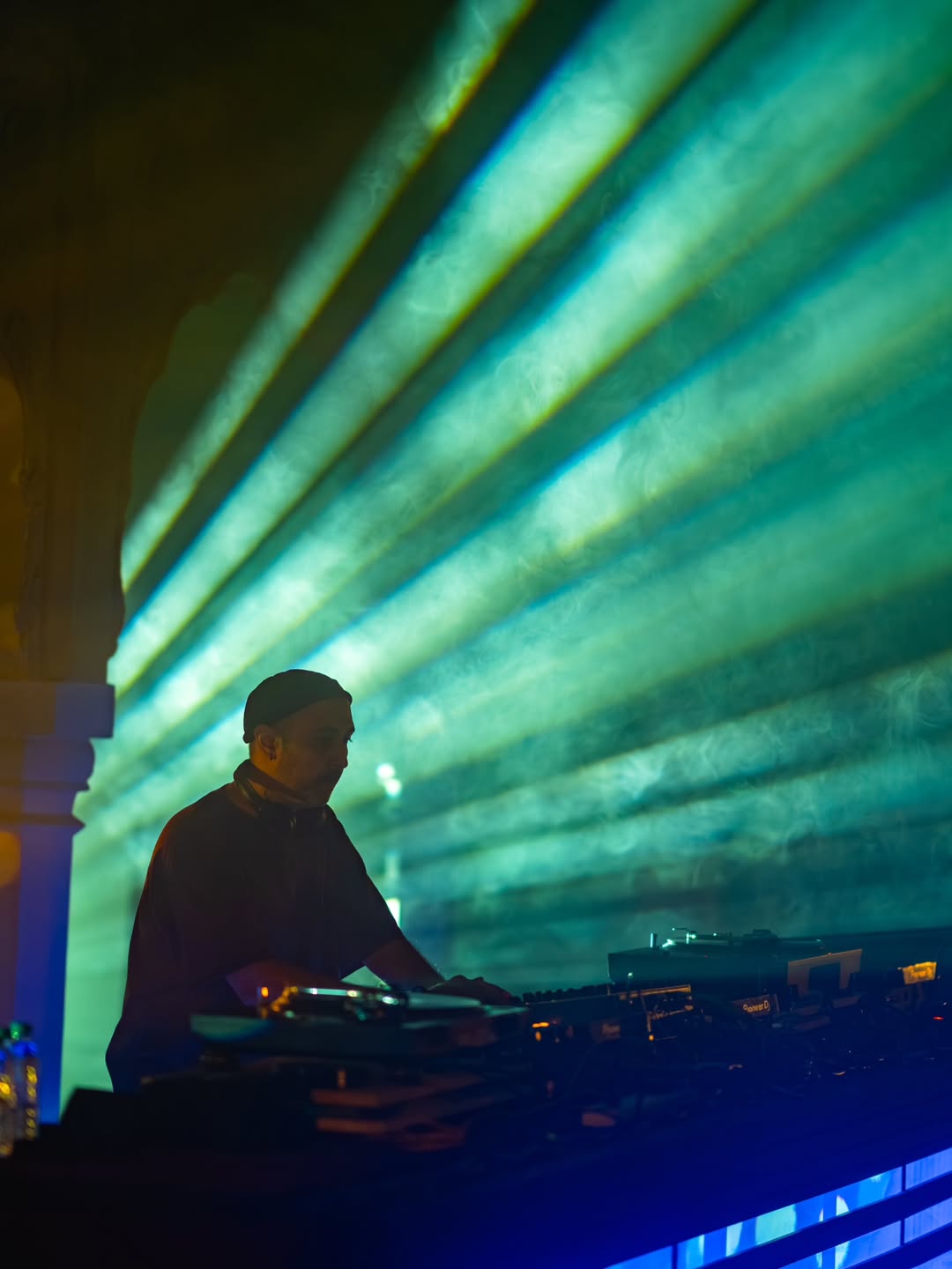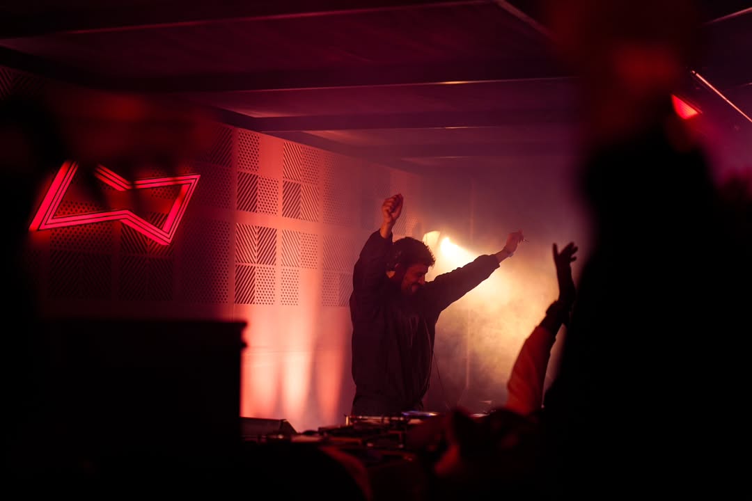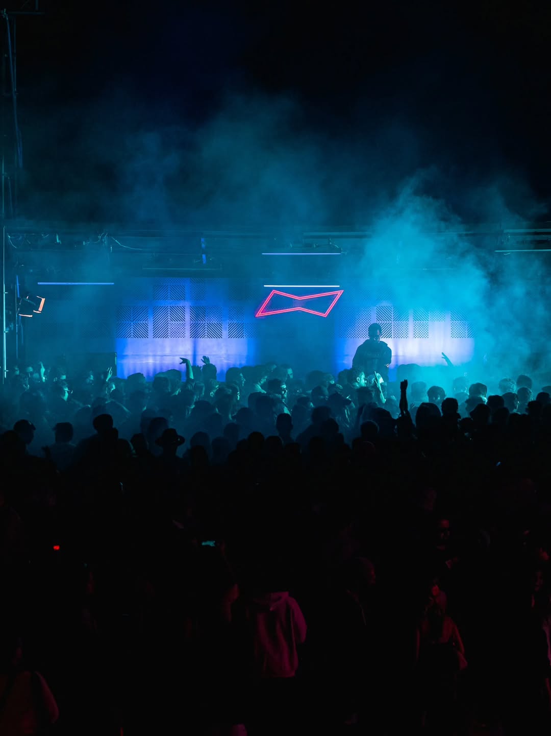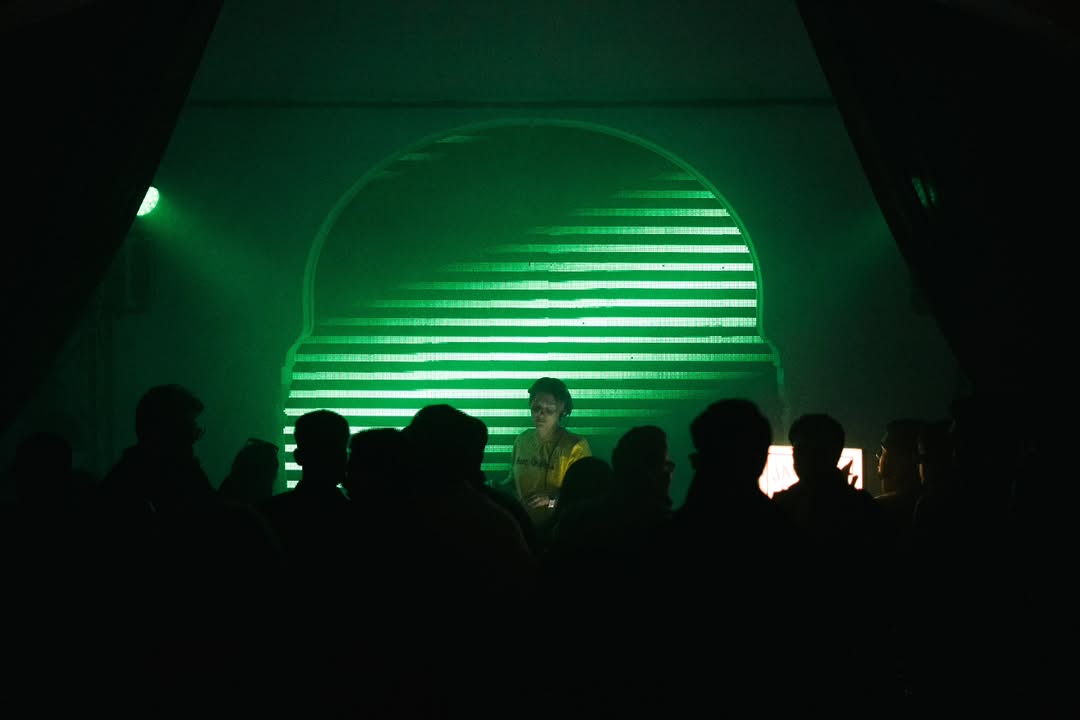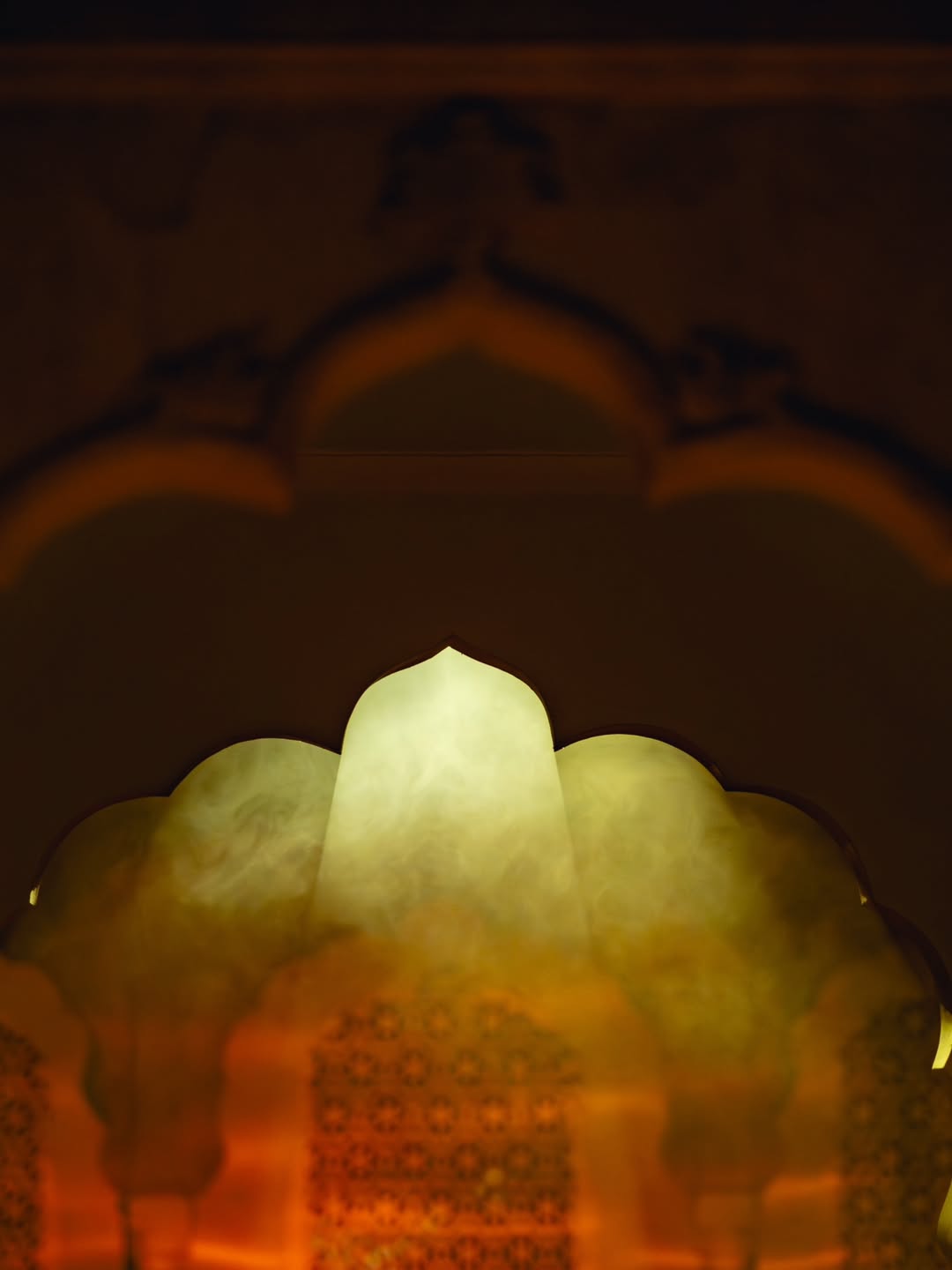 The Stepwell stage used subtle moving reflections from the surrounding water, creating soft, shifting light textures that complemented the ambient music showcase. The East stage played with shadow and form - light passing through cut-out motifs of the festival logo filled the haze, illuminating the raw scaffolding structure and creating layered silhouettes across the space. The Yurt glowed with warm pastel tones filtering through wooden cut-outs, transforming the circular arena into an intimate space bathed in soft, radiant light. The Club featured a retro LED installation with horizontal cuts, creating bold visual rhythms and sharp contrasts against the darkness. The Rayban stage, Positioned at the centre of the festival grounds out with a warm red glow amidst a wide green courtyard. Since this is the first look, on entering the palace the aim was to make it warm and inviting.